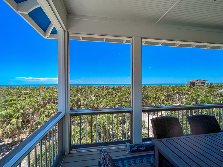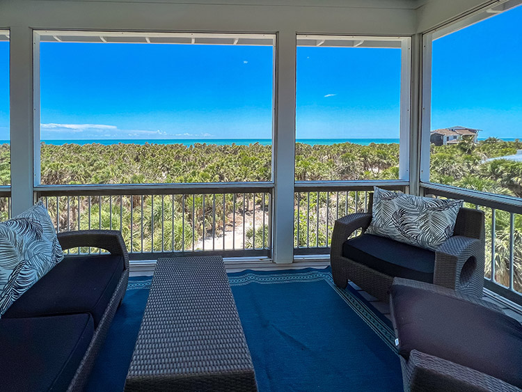 This extraordinary 4 bedroom coastal retreat is the essence of luxury & beach living! Located just one row from the scenic island preserve just a short stroll from the beach access, you'll enjoy impressive panoramic gulf views and sunsets right from the comfort of your living room and screened porch - a stunning backdrop to immerse yourself in the island's natural beauty. On the first floor, you'll discover two spacious master bedroom suites, each boasting its own en suite bath, creating a private sanctuary to unwind and rejuvenate. Two guest bedrooms with a shared bath offer ample space for family and friends.