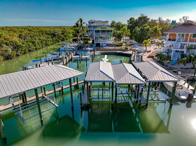 Private covered slip in the Island Club of North Captiva marina offering a boat lift, electric and water hookups, and a protected basin location ideal for secure island dockage.