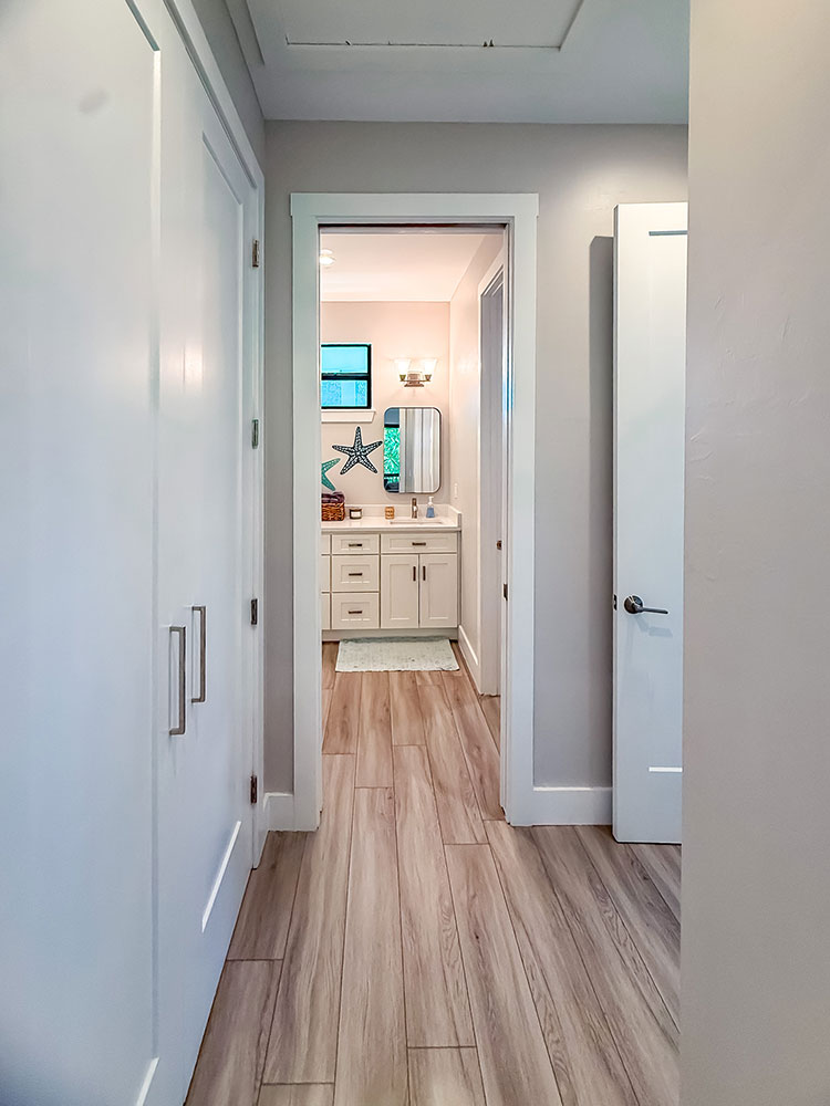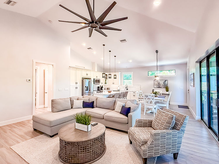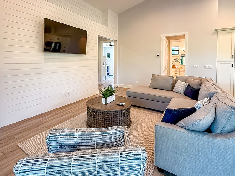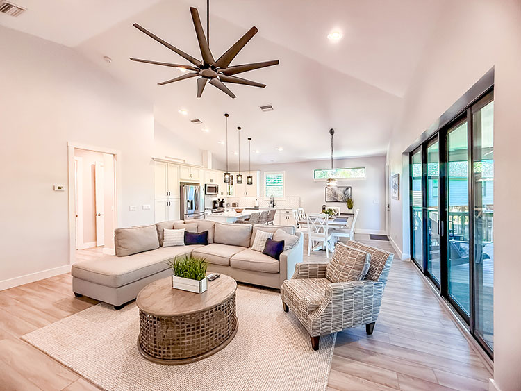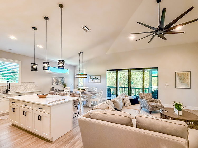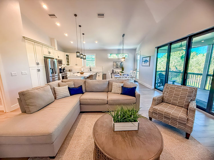 Enjoy seamless indoor-outdoor living with multiple porches—a shaded front porch, a covered screened lanai, and an open sun deck perfect for relaxing after beach or boating adventures. Cathedral ceilings run throughout the home, creating a bright, breezy atmosphere and allowing for natural light in every room.