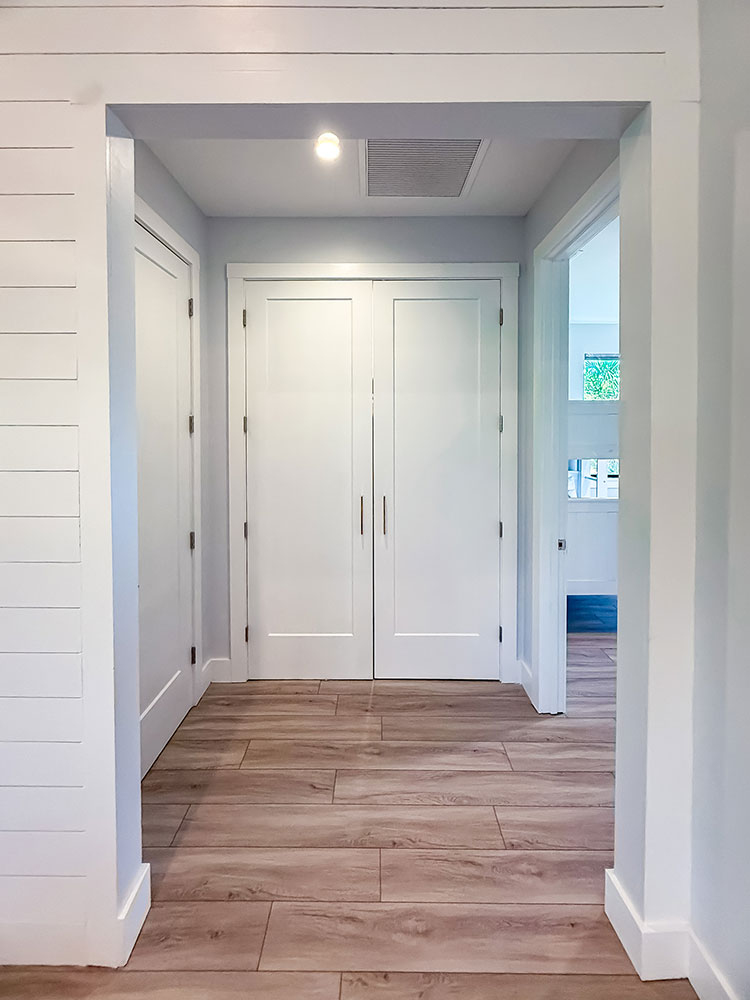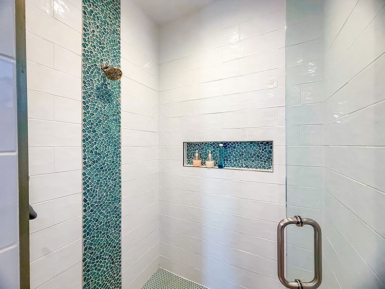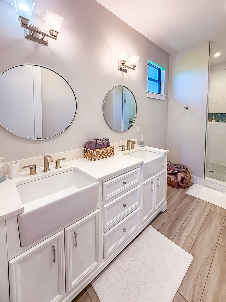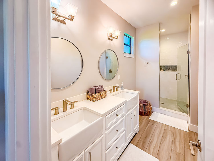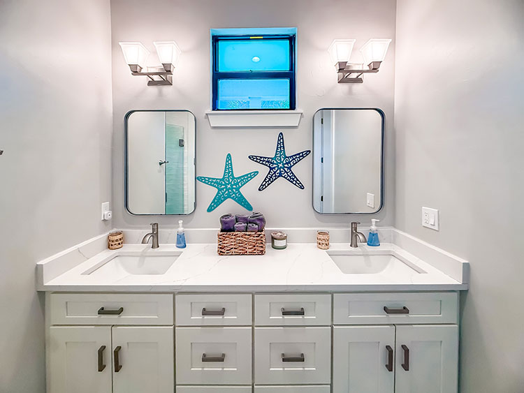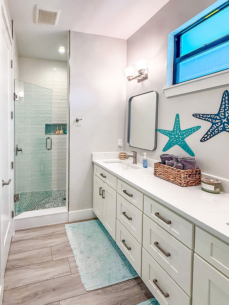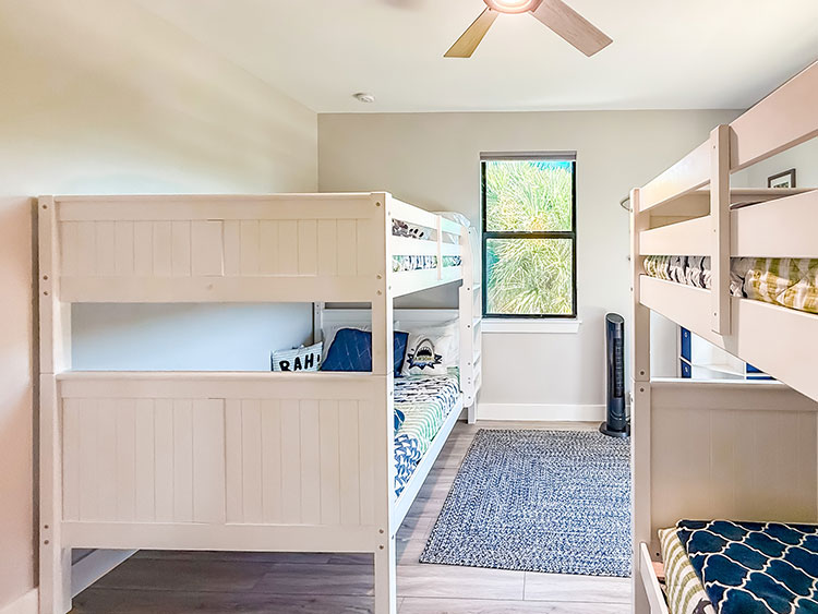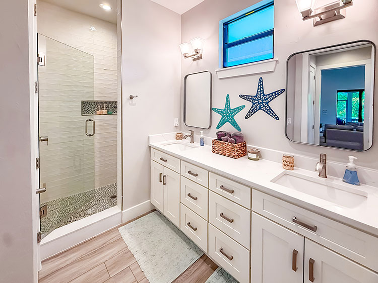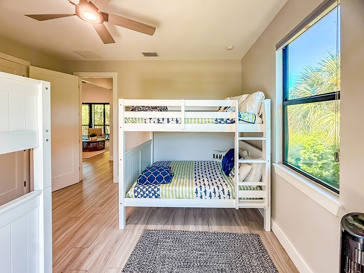 The primary suite offers its own private entrance to the sun porch and features a luxurious en suite bath with dual vanities and a custom-tiled walk-in shower. Two additional bedrooms (including a bunk room) and a beautifully appointed guest bath provide plenty of space for guests.