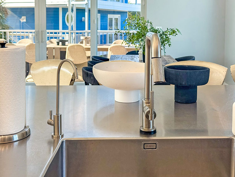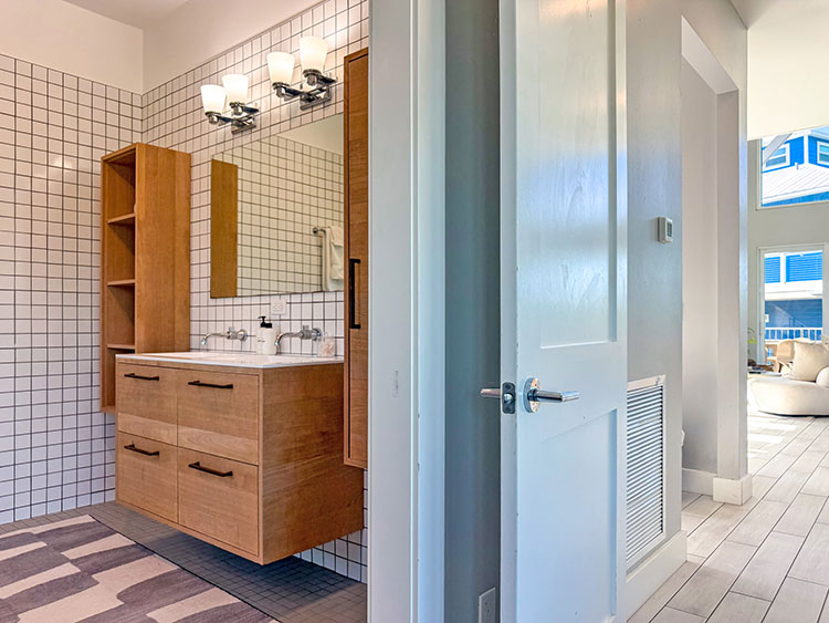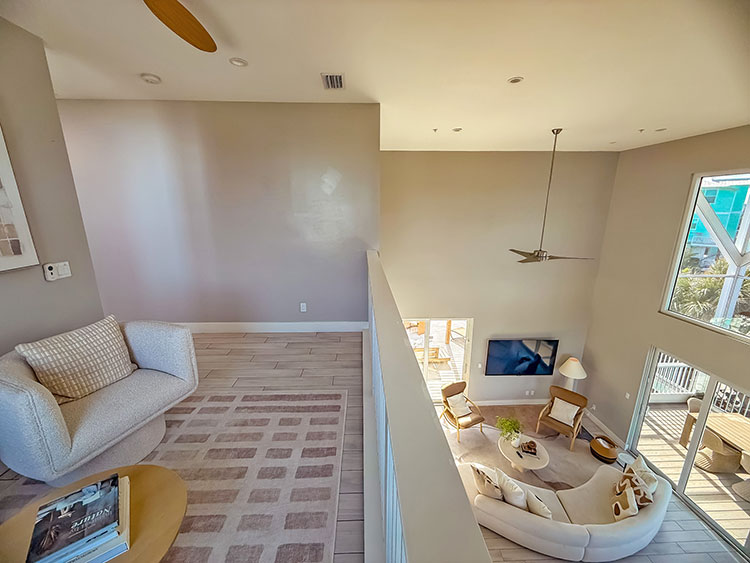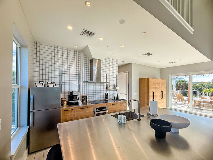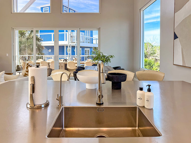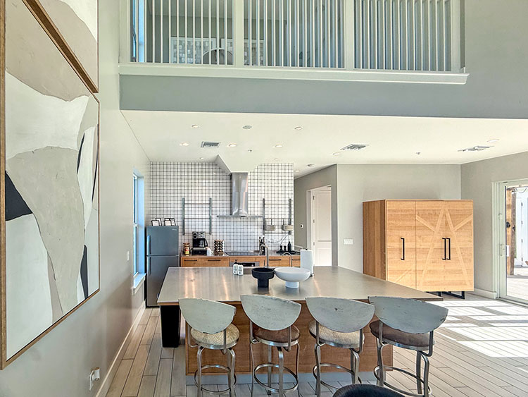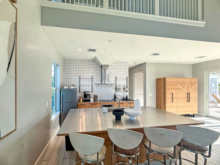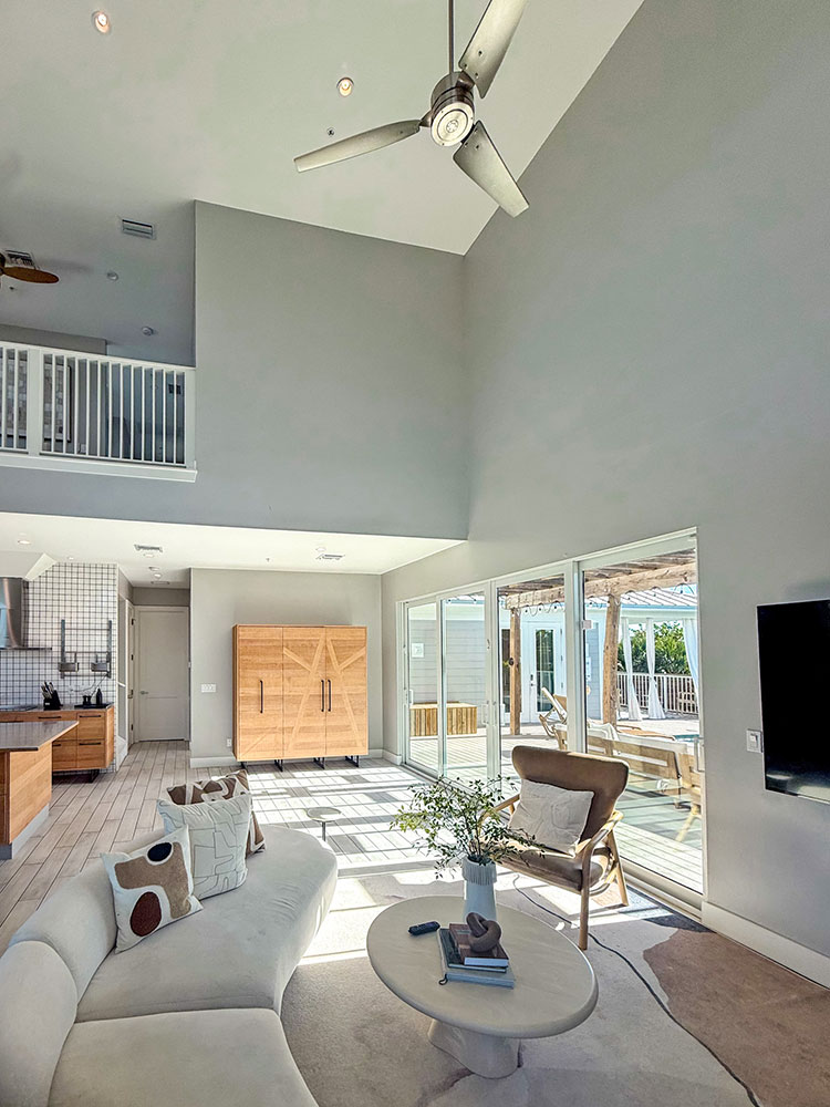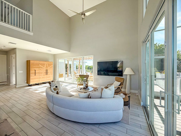 The main living level stuns with soaring double-story ceilings and an open-concept great room, wrapped in refined contemporary coastal finishes. A restaurant-inspired kitchen anchors the space, ideally suited for celebratory dinners, casual brunches, or catered events, with multiple dining areas flowing seamlessly indoors and out.