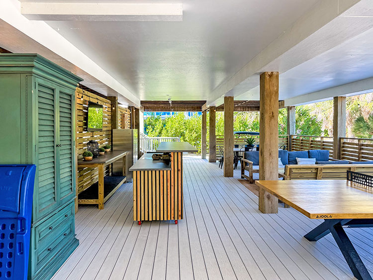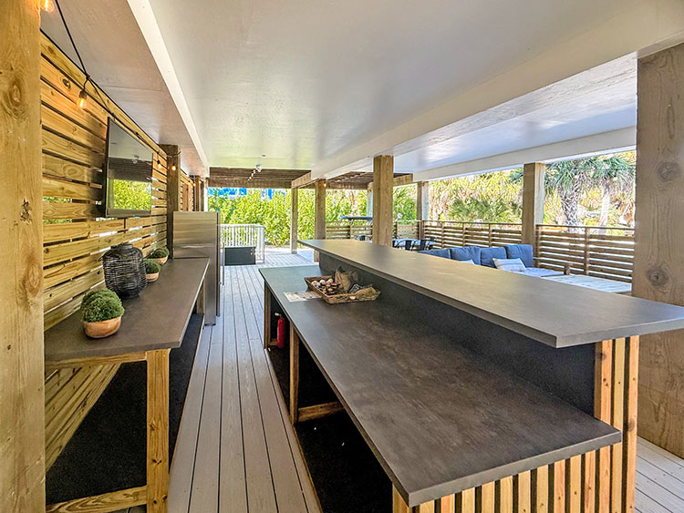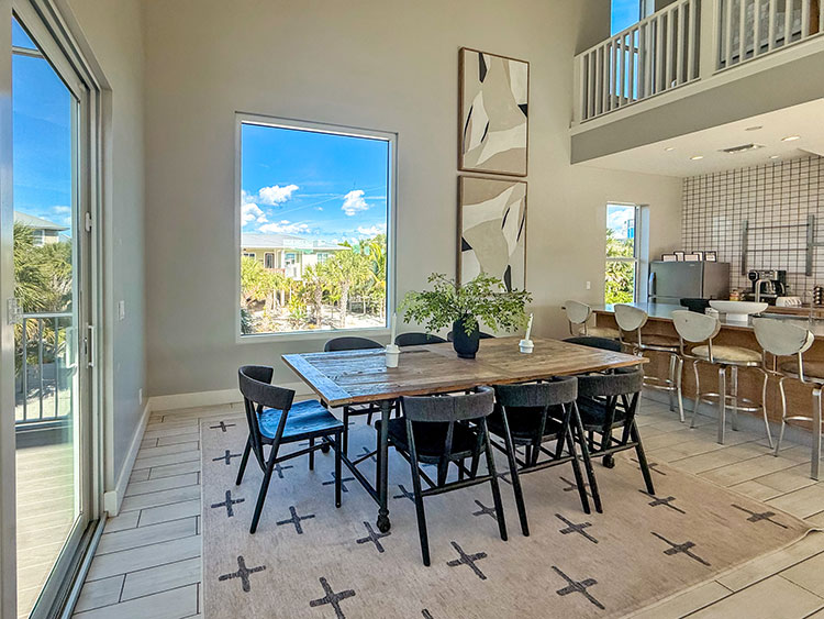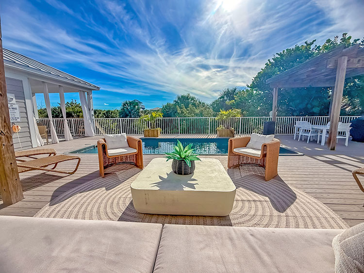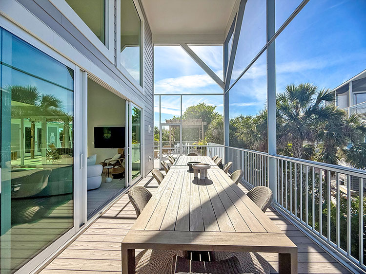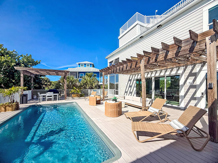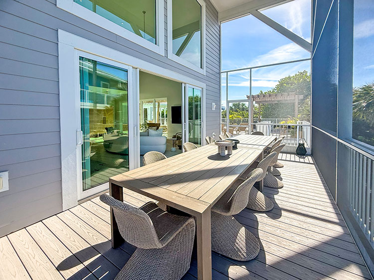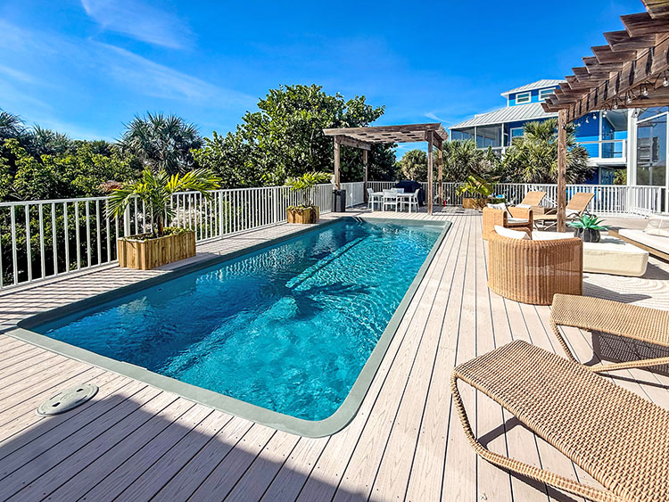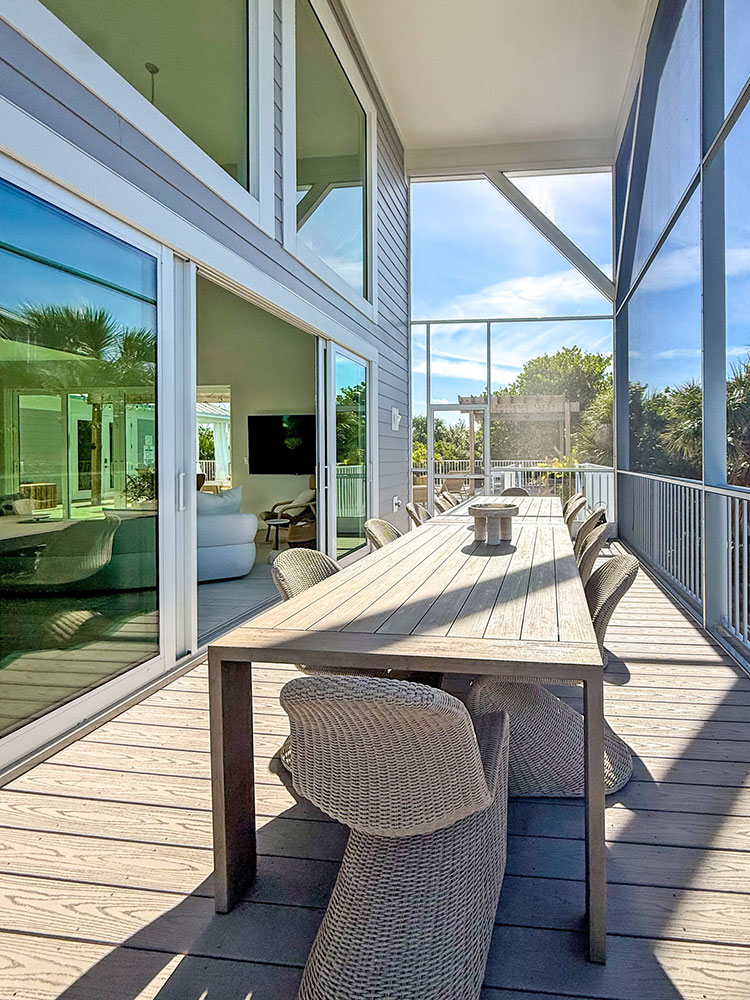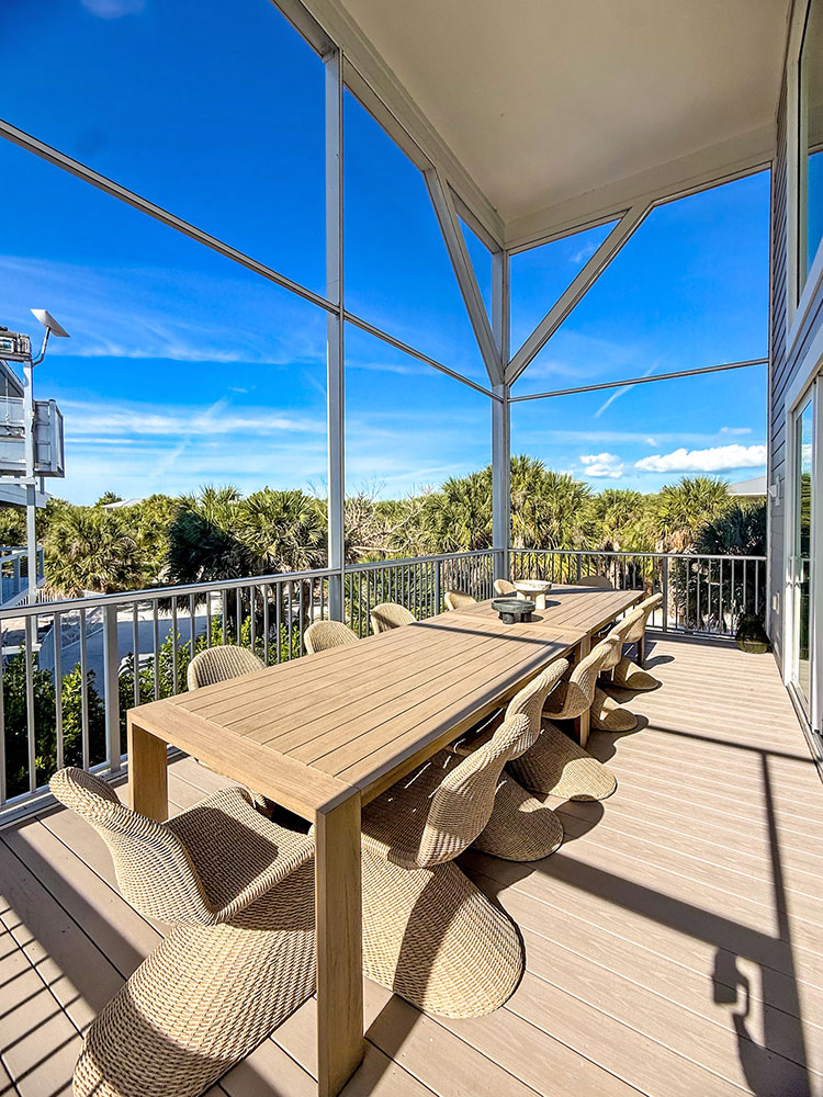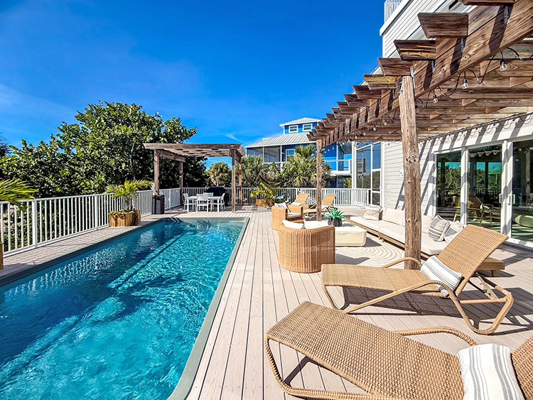 From sunrise to sunset, the home unfolds in layers of connection and calm. Mornings begin on the screened terrace with coffee and the sound of distant waves. Afternoons drift by poolside, floating beneath blue skies or gathering at the outdoor bar as laughter carries on the breeze. Evenings rise to the rooftop porch, where a panorama of island views, with rooftop peeks of the Gulf, Bay, and preserve, stretches endlessly with sunsets and stars that feel like a private performance just for you.
